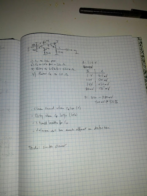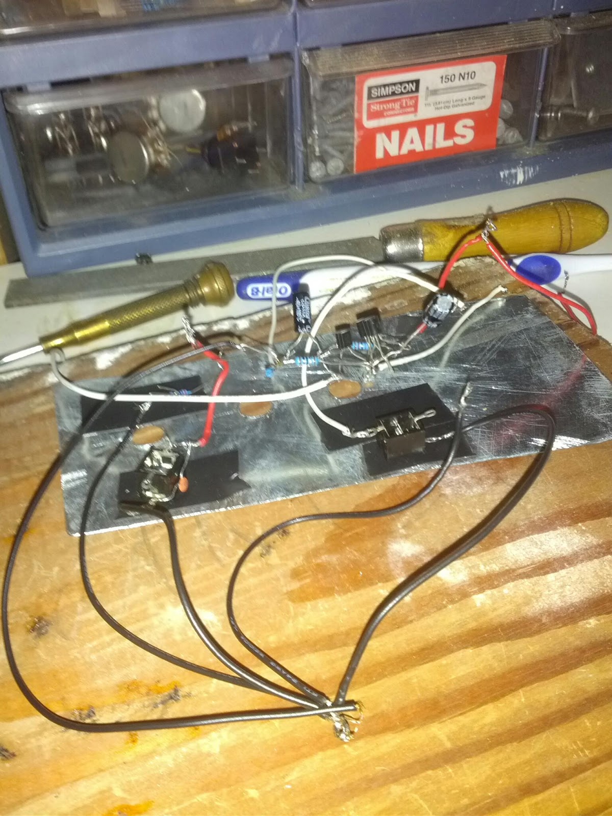 I've decided on the style of amp to use. With one cell of power, a small voltage amp stage followed by a Sziklai pair emitter follower seems to provide enough power to headphones. The voltage stage, with pots on both the collector and emitter, gives a nice range of clean to dirty sounds. You can see the rest setup below.